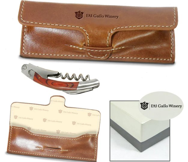 A wine lover's tool, the Sommelier's Corkscrew is a substantial piece of hardware made in stainless steel and rosewood, packaged in a leather case for protection. Approximate size: 5.125"x 2" x 1".